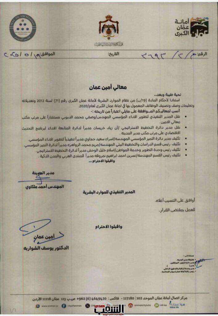 صدةى الشعب – وافق أمين عمان الدكتور يوسف الشواربة على تنسيب مدير المدينة المهندس أحمد ملكاوي بإجراء عدد من التنقلات والتكليفات الإدارية التي طالت كبار الموظفين، كما توضح الوثيقة التي تلي السطور، و شملت التنقلات و التكليفات الأسماء التالية: (الدبوبي و خريسات و حجاوي و الزواهرة و الوحش و نمروقة)