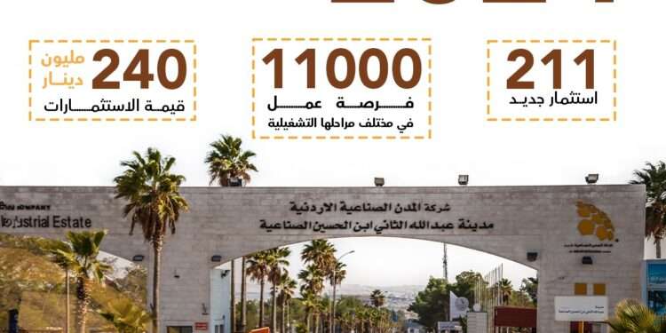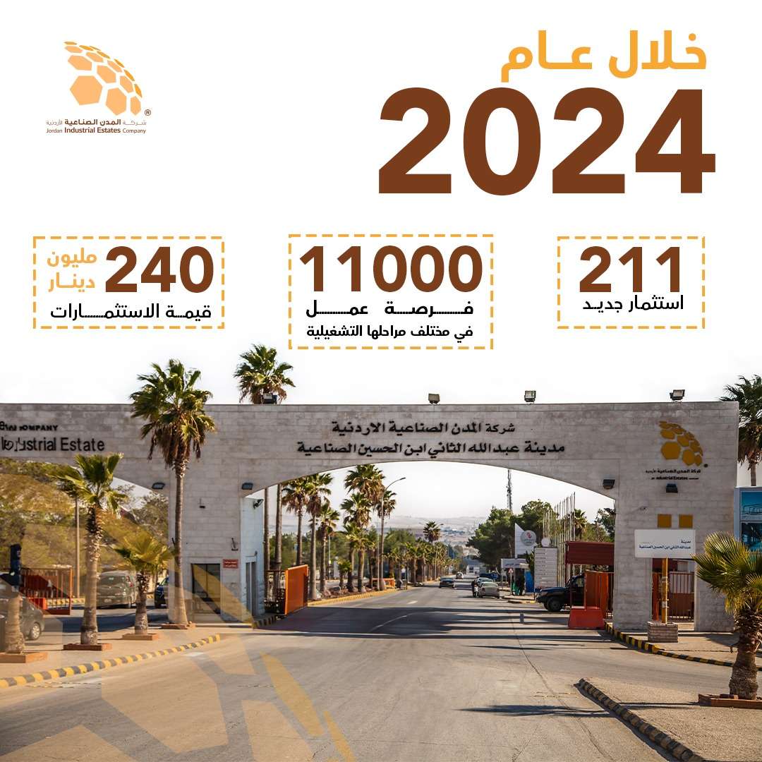 فقد أعلن مدير عام شركة المدن الصناعية الاردنية السيد عمر جويعد عن استقطاب 211 استثمار جديد خلال العام 2024 للمدن الصناعية العاملة في مختلف محافظات المملكة بحجم استثمار يقارب (240) مليون دينار اردني يتوقع أن توفر قرابة (11) الف فرصة عمل في مختلف مراحلها التشغيلية.