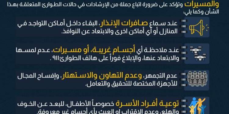 - عند ملاحظة أي أجسام غريبة، أو مسيرات، عدم لمسها والابتعاد عنها، والإبلاغ فوراً على هاتف الطوارئ 911 .