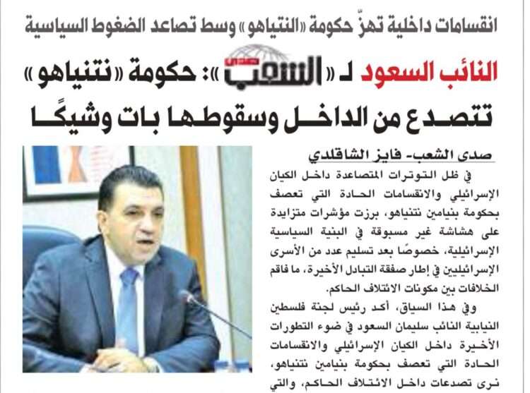 وفي هذا السياق ، أكد رئيس لجنة فلسطين النيابية النائب سليمان السعود في ضوء التطورات الأخيرة داخل الكيان الإسرائيلي والانقسامات الحادة التي تعصف بحكومة بنيامين نتنياهو، نرى تصدعات داخل الائتلاف الحاكم، والتي تعكس هشاشة غير مسبوقة في البنية السياسية الإسرائيلية، خصوصًا بعد تسليم عدد من الأسرى الإسرائيليين في إطار صفقة التبادل.
