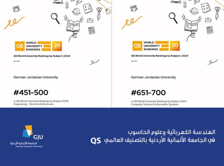 حققت الجامعة الألمانية الأردنية وهي جامعة حكومية رسمية إنجازاً جديداً ولأول مرة منذ تأسيسها عام 2005 تمثل بتصنيف مجالات الهندسة الكهربائية وعلوم الحاسوب بالجامعة ضمن التصنيف العالمي QS 2024 by subject.