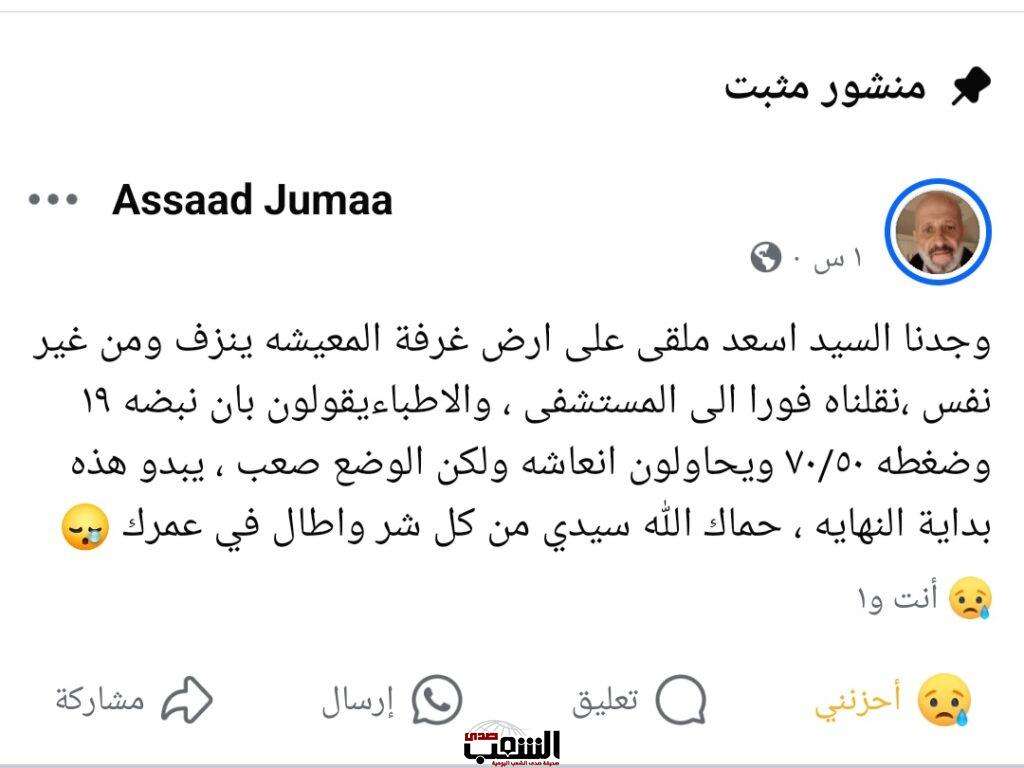و تالياً ما نشرته: “وجدنا السيد اسعد ملقى على ارض غرفة المعيشه ينزف ومن غير نفس ،نقلناه فورا الى المستشفى ، والاطباء يقولون بأن نبضه ١٩ وضغطه ٧٠/٥٠ ويحاولون إنعاشه ولكن الوضع صعب، يبدو هذه بداية النهاية، حماك الله سيدي من كل شر واطال في عمرك”.