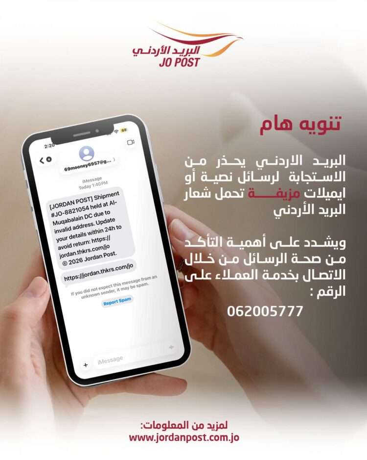 وشدد البريد الأردني على ضرورة تجاهل وحذف أي رسالة من هذا النوع، وعدم التعامل معها بأي شكل من الأشكال وضرورة التأكد من صحة الرسائل عن طريق الاتصال بخدمة العملاء بشركة البريد الأردني على الرقم