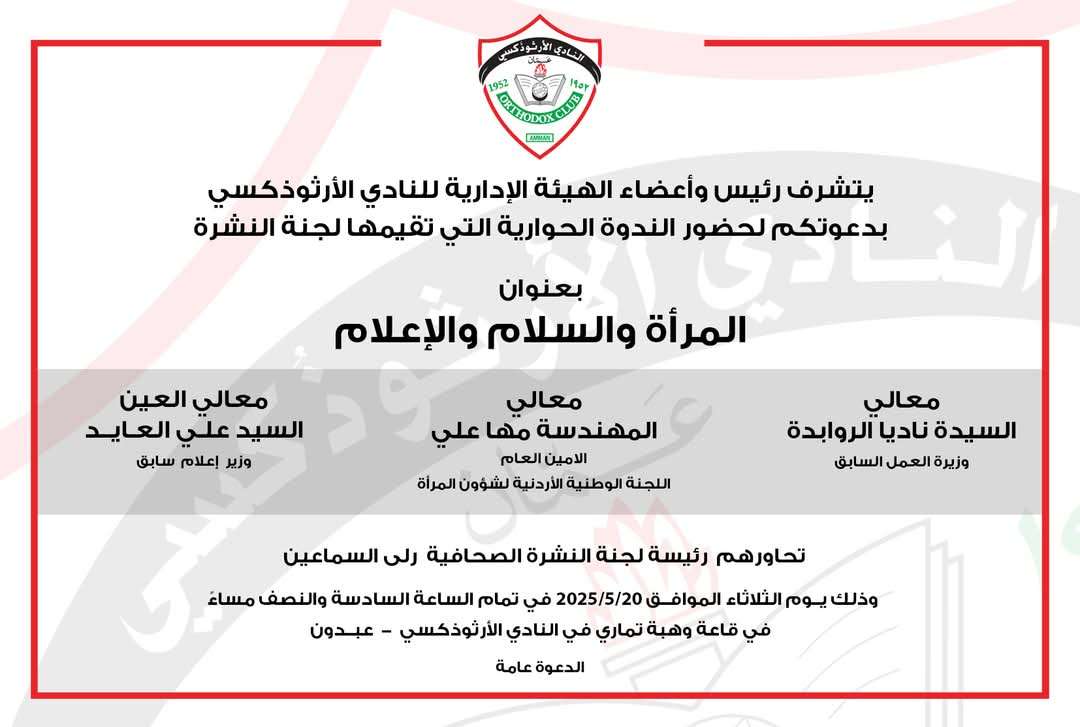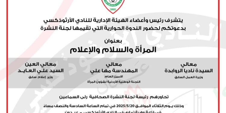 تشرفت اليوم بدعوتي لحضور الندوة الحوارية بعنوان المرأة والسلام والإعلام مع معالي السيدة ناديا الروابدة وزيرة العمل السابقة، ومعالي المهندسة مها علي الأمين العام للجنة الوطنية الأردنية لشؤون المرأة، ومعالي العين السيد علي العايد وزير الإعلام السابق، تحاورهم رئيسة لجنة النشرة الصحافية رلى السماعين.