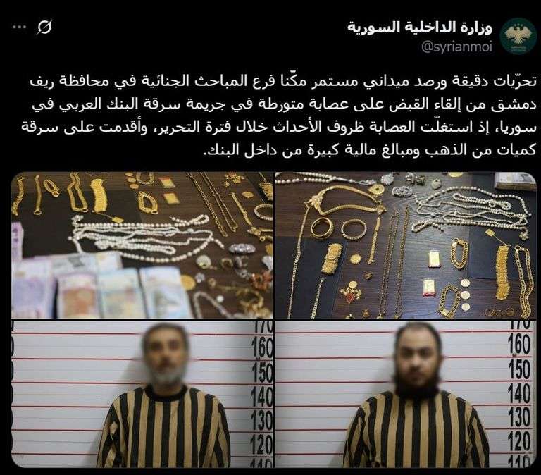 وقالت وزارة الداخلية في بيان مساء الأحد: “بعد تحريات دقيقة ورصد ميداني مستمر تمكن فرع المباحث الجنائية في محافظة ريف دمشق من إلقاء القبض على عصابة متورطة في جريمة سرقة البنك العربي في سوريا، إذ استغلت العصابة ظروف الأحداث خلال فترة التحرير، وأقدمت على سرقة كميات من الذهب ومبالغ مالية كبيرة من داخل البنك”.