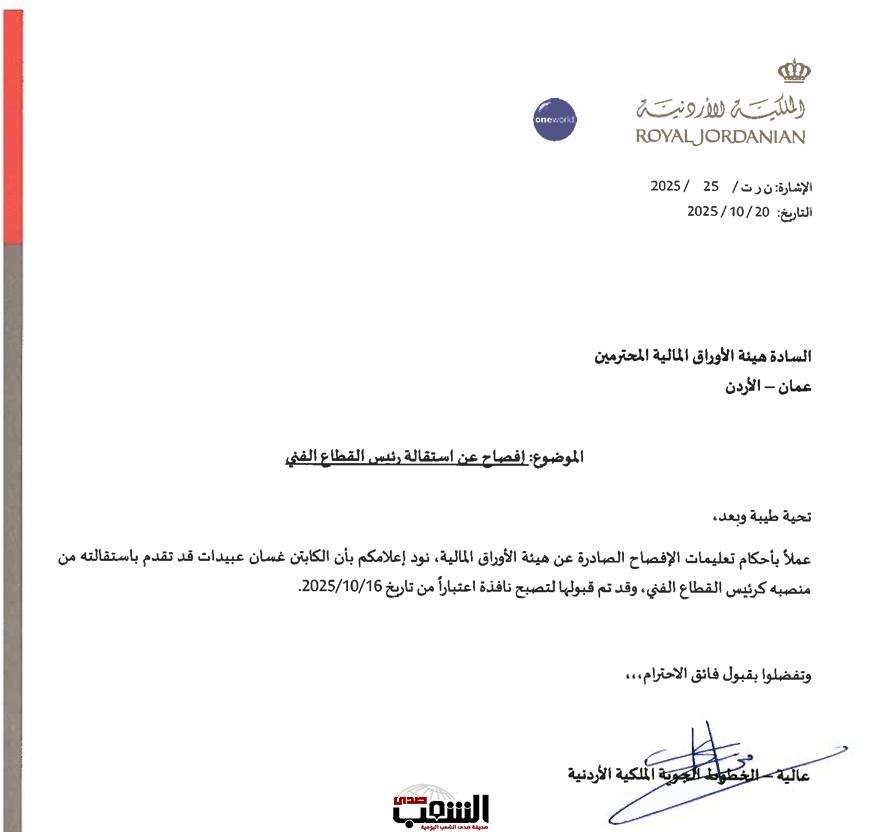 استقالة (رئيس القطاع الفني) في الملكية الأردنية .. وثيقة