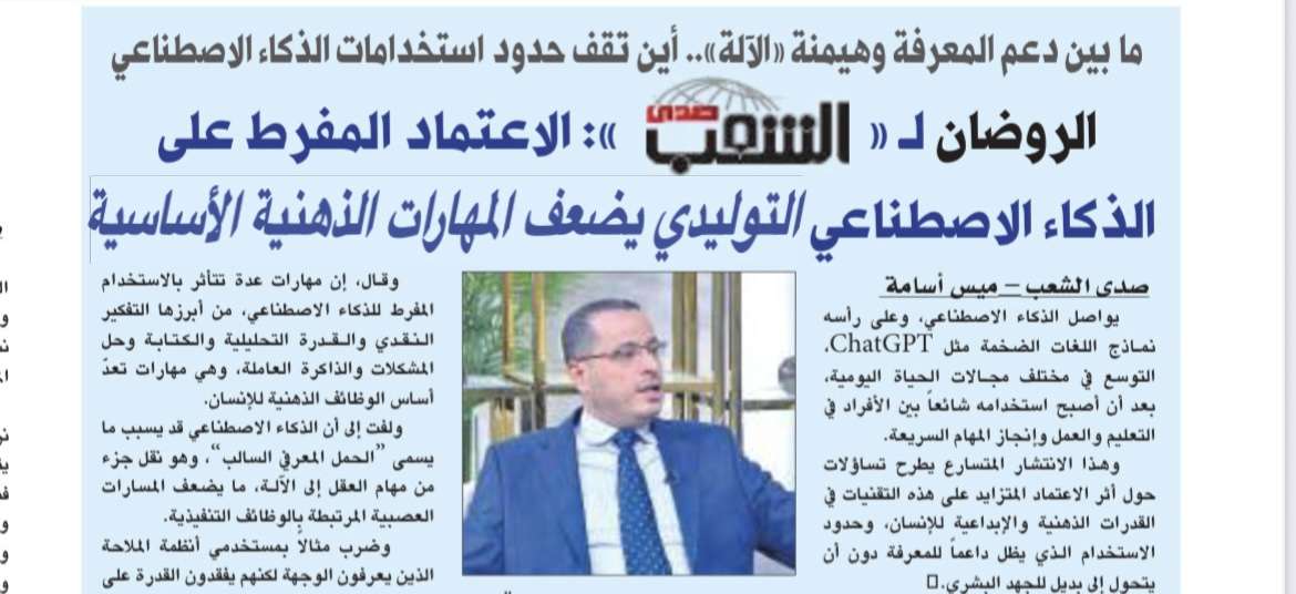 الروضان لـ”صدى الشعب”: الاعتماد المفرط على الذكاء الاصطناعي التوليدي يضعف المهارات الذهنية الأساسية