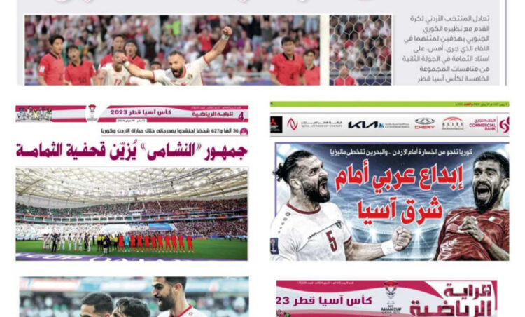وأثنت الصحف القطرية على أداء النشامى في مباراته أمام كوريا تحت عناوين رئيسية داعمة ومشيدة بهذا الأداء، منها “النشامى أرهقوا الشمشون”، و “إبداع عربي أمام شرق آسيا”، و”كوريا تنجو من الخسارة أمام الأردن”، و”العرب أشعلوا المجموعة الخامسة”، و”النشامى انتزعوا أغلى نقطة كورية”.