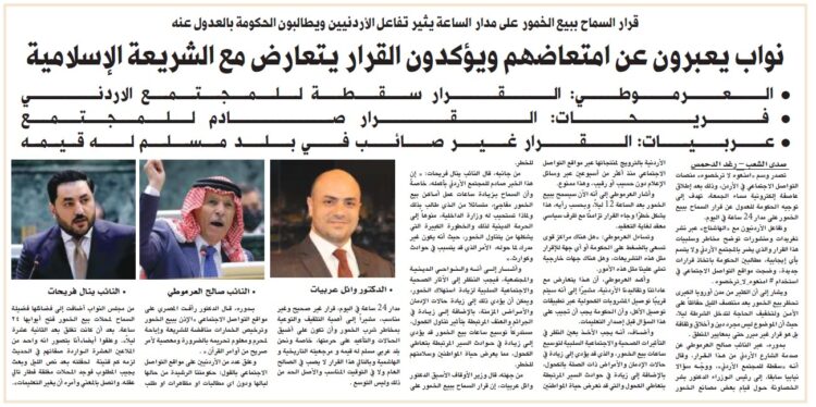 بدوره، عبر النائب صالح العرموطي عن صدمة الشارع الأردني من هذا القرار، وقال أنه “سقطة للمجتمع الأردني”، ووجّه سؤالا نيابيا سابقا، إلى رئيس الوزراء الدكتور بشر الخصاونة حول قيام بعض مصانع الخمور الأردنية بالترويج لمنتجاتها عبر مواقع التواصل الاجتماعي منذ أكثر من أسبوعين عبر وسائل الإعلام دون حسيب أو رقيب، وهذا ممنوع.