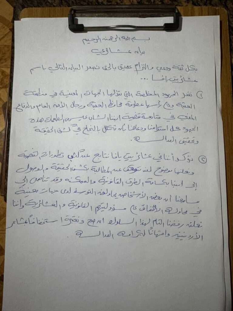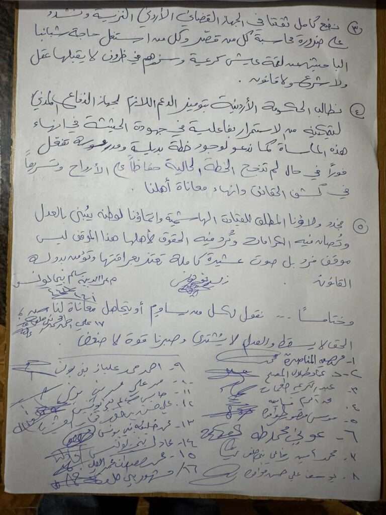 وفي ختام البيان، جدّدت العشائر ولاءها المطلق للقيادة الهاشمية، وانتماءها لوطن يقوم على قيم العدالة وسيادة القانون وصون الكرامات، مؤكدة أن صوتها هو صوت عشيرة تؤمن بالدولة ومؤسساتها، وترفض أي مساومة على حق أو التفريط في كرامة ابنائها.