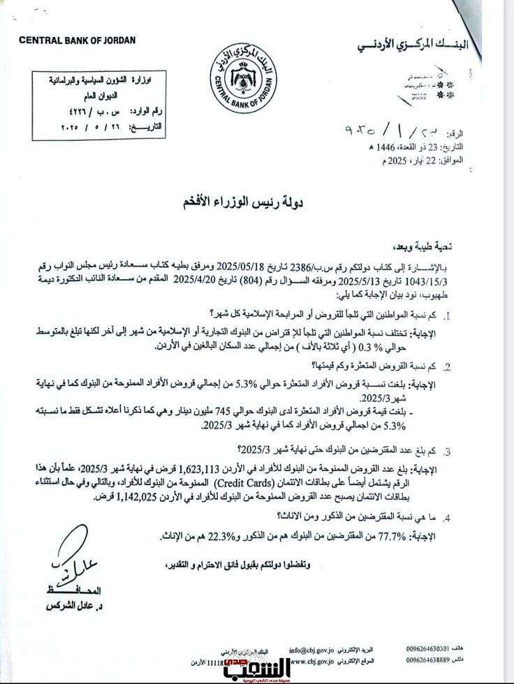 وأكد البنك المركزي الأردني أن هذه البيانات تأتي في إطار التزامه بالشفافية وتوفير المعلومات الدقيقة حول واقع الائتمان المصرفي في المملكة، دعمًا لصنّاع القرار والرقابة النيابية.