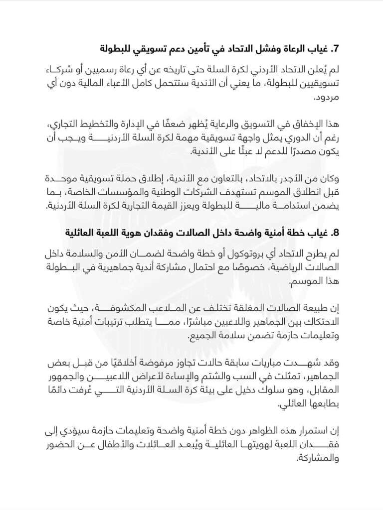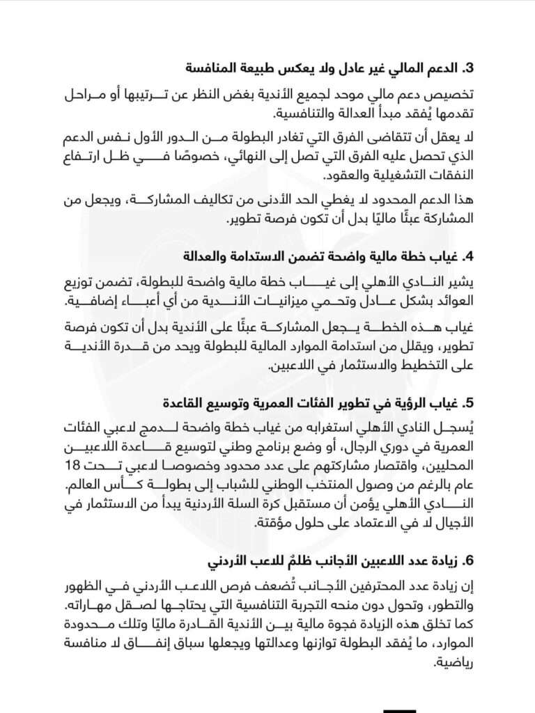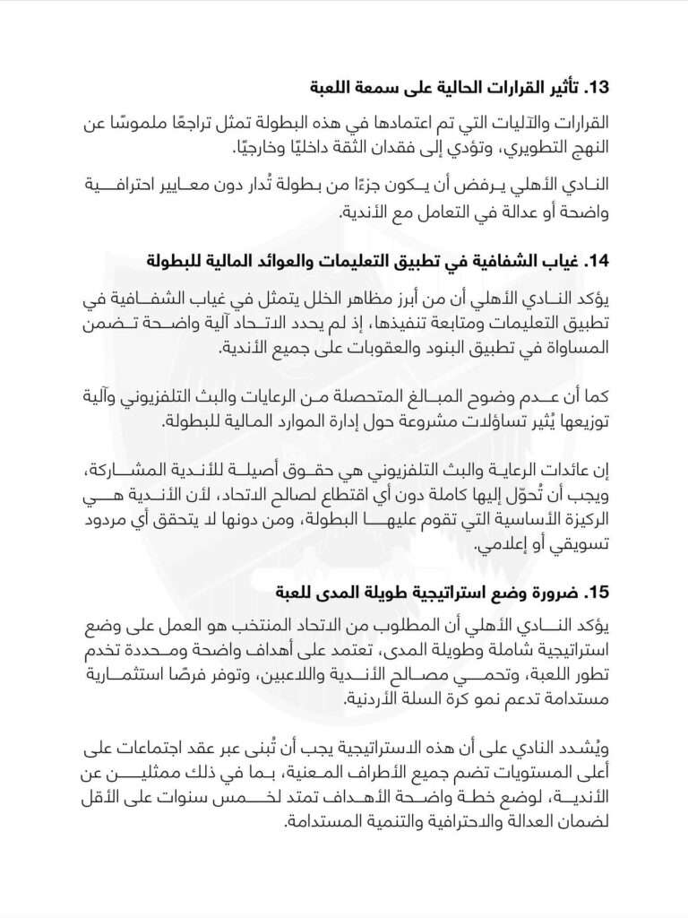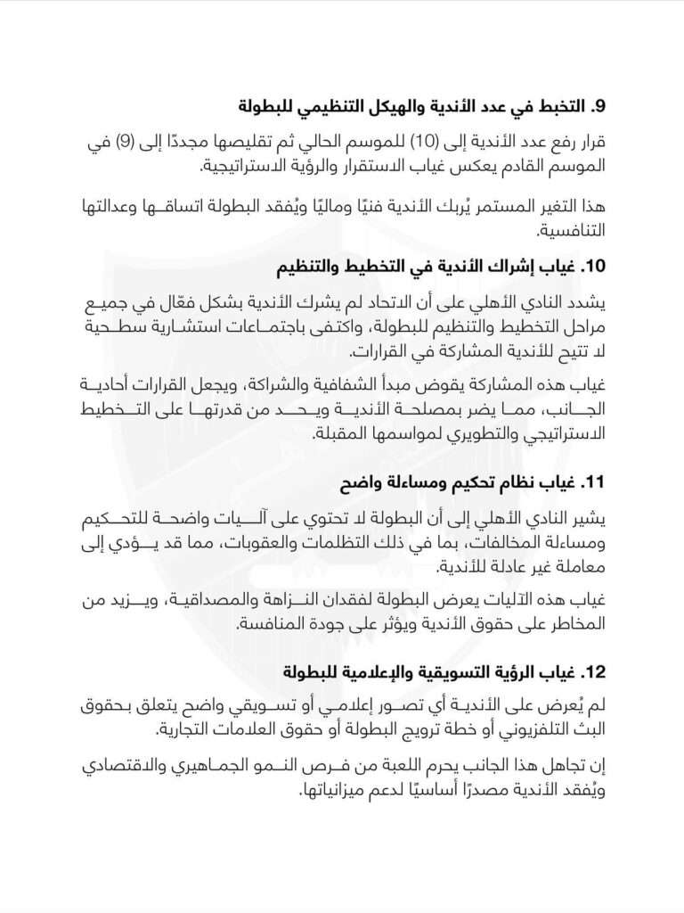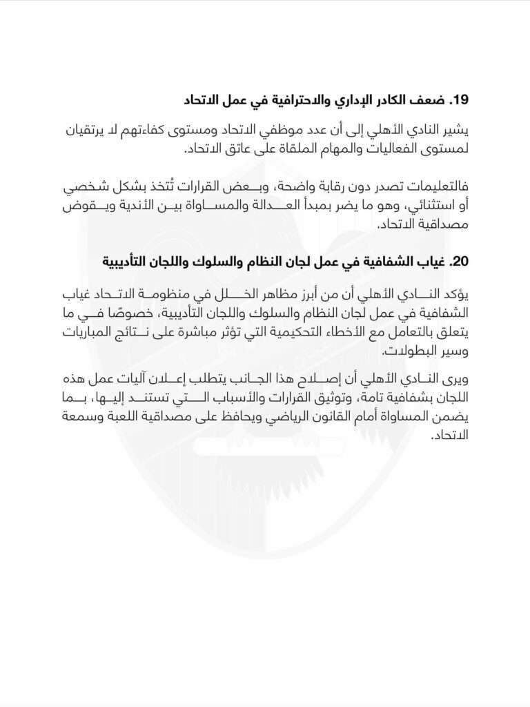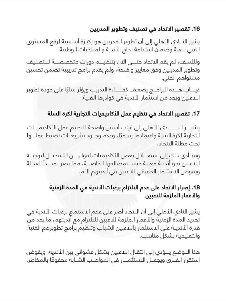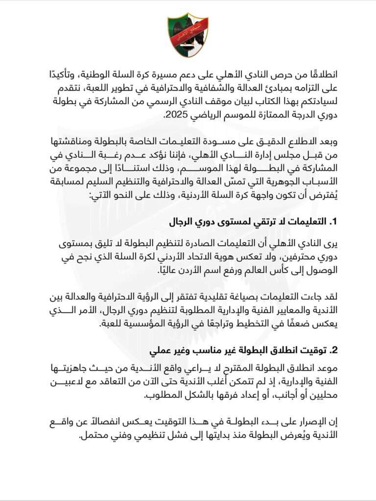 و أصدر الأهلي عبر صفحته الرسمية بياناً أوضح فيه 20 نقطة كانت وراء اعتذاره عن المشاركة في الدوري، أبرزها أن التعليمات لا ترتقي لمستوى دوري الرجال الدعم المالي غير عادل و تويت الدوري غير مناسب و و تالياً نص البيان كاملاً: