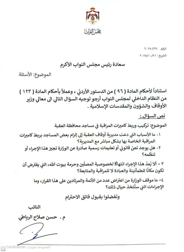 وجه النائب عن محافظة العقبة حسن الرياطي سؤالا لوزير الأوقاف والشؤون و المقدسات الإسلامية عن الأسباب التي دعت مديرية أوقاف العقبة لتركيب كاميرات داخل المساجد وربطها بشكل مباشر مع المديرية