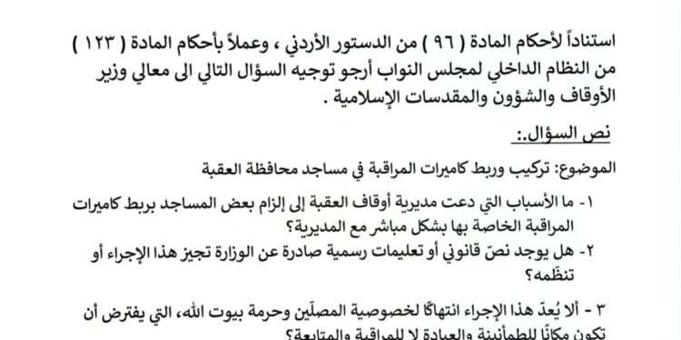 وجه النائب عن محافظة العقبة حسن الرياطي سؤالا لوزير الأوقاف والشؤون و المقدسات الإسلامية عن الأسباب التي دعت مديرية أوقاف العقبة لتركيب كاميرات داخل المساجد وربطها بشكل مباشر مع المديرية
