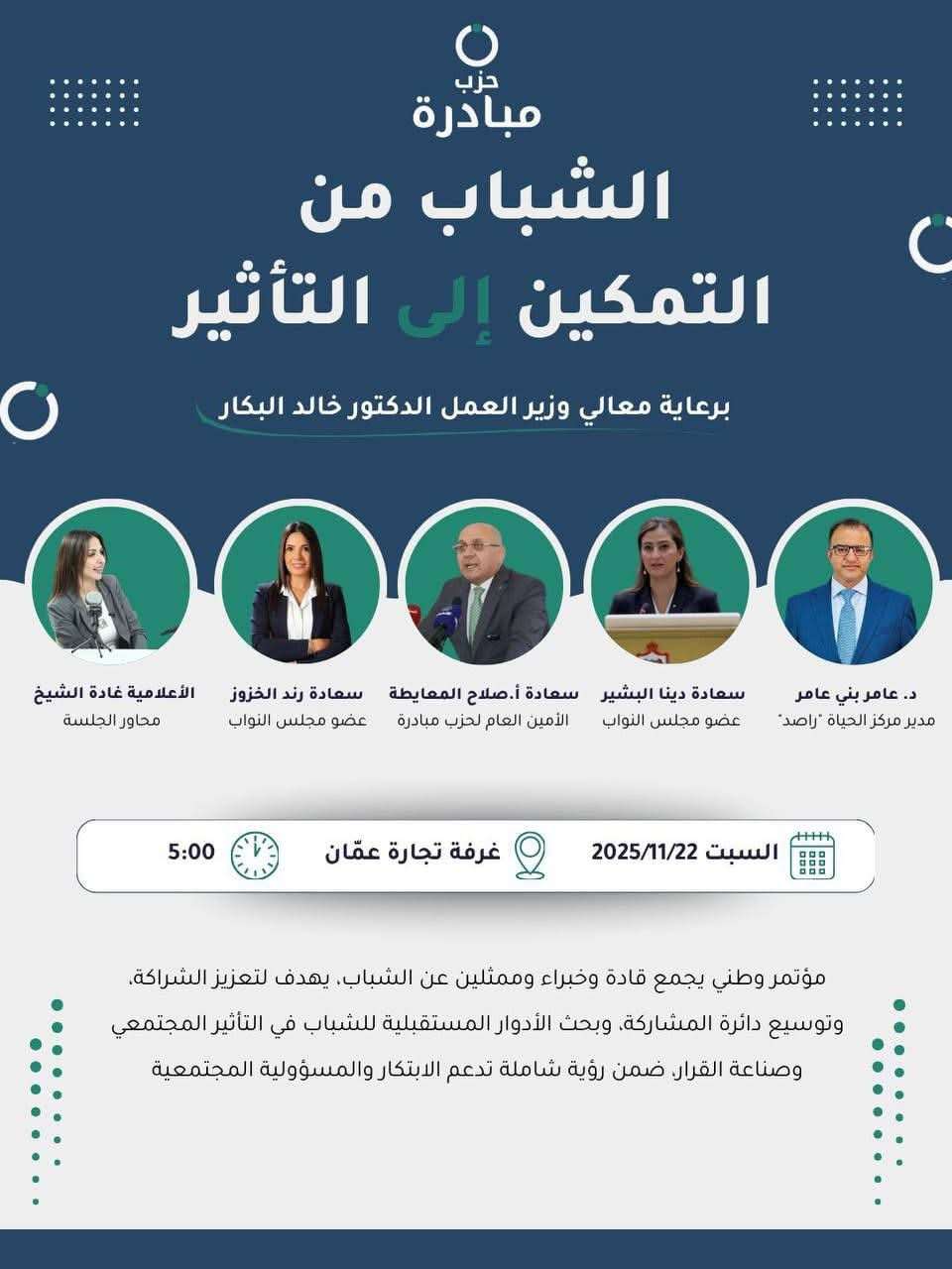 “الشباب من التمكين إلى التأثير”، وذلك يوم السبت 22 تشرين الثاني 2025 عند الساعة الخامسة مساءً في غرفة تجارة عمّان.