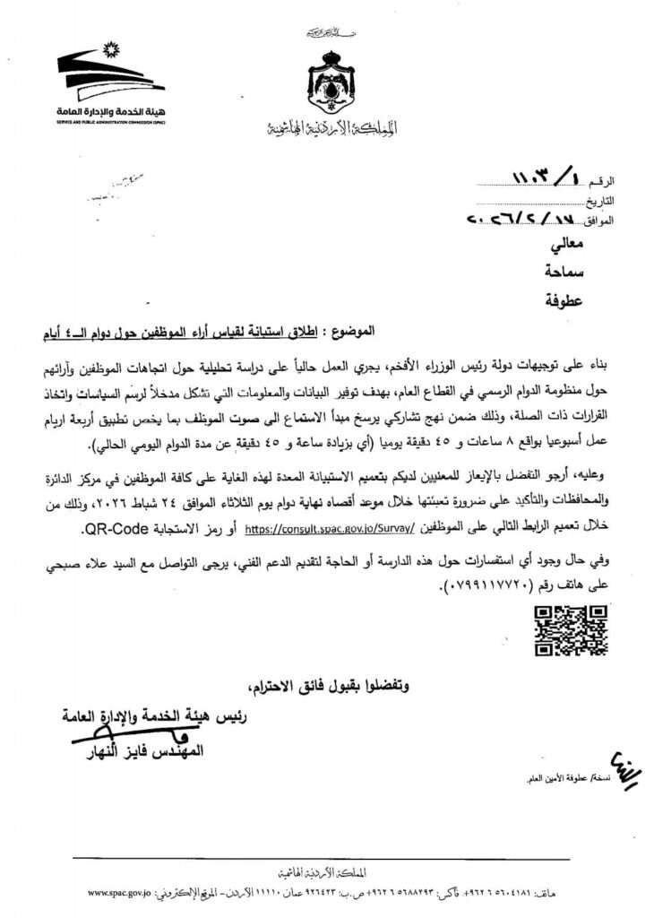 صدى الشعب – دعت هيئة الخدمة والإدارة العامة موظفي القطاع العام للمشاركة في استبيان دراسة آراء موظفي القطاع العام حول مقترح تطبيق نظام الدوام الرسمي 4 أيام عمل، بواقع 7 ساعات 45 دقيقة يومياً، علماً بأن آخر موعد للمشاركة هو يوم الثلاثاء الموافق 24/2/2026.