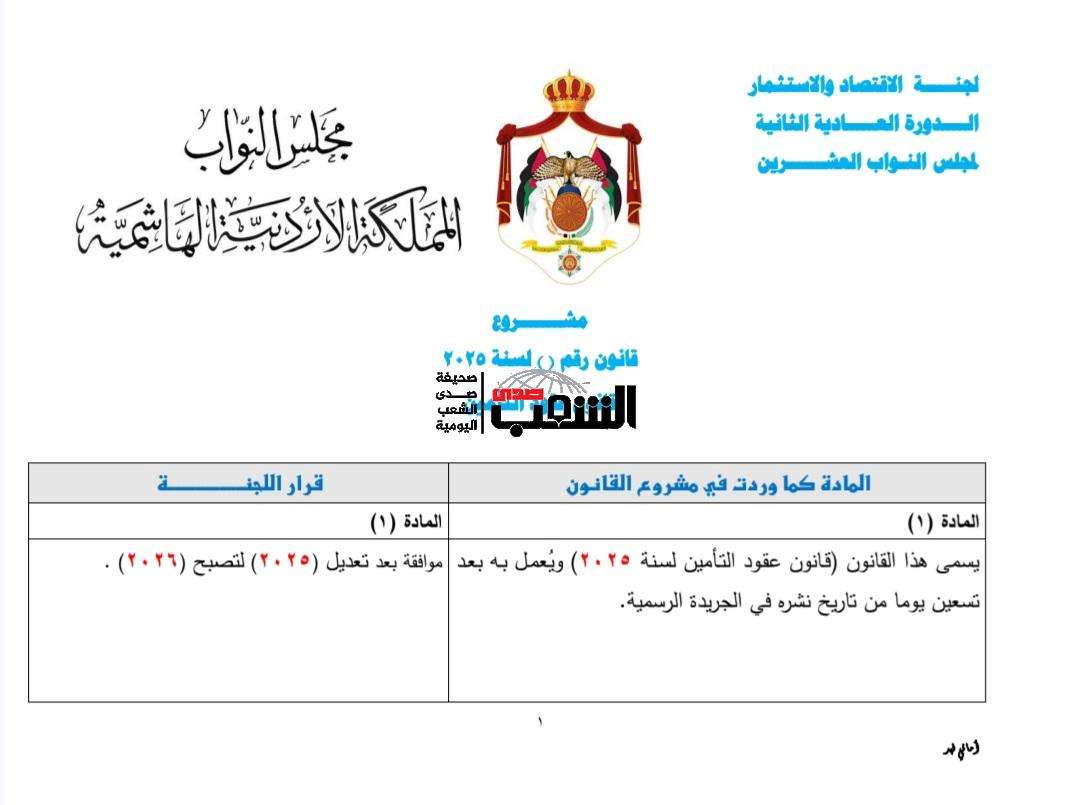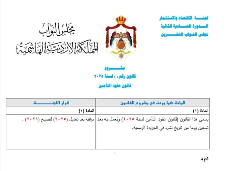 و يتألف مشروع القانون، المُحَوّل من لجنة الاقتصاد و الاستثمار بعد أن عقدت 5 اجتماعات بين شهر كانون ثاني و شباط 2026 لمناقشة مشروع القانون و ساعات مطولة بحضور أصحاب الخبرة من المؤسسات العامة و الخاصة، من غرف تجارية و نقابات، إضافة لوزير الدولة للشؤون القانونية فياض القضاة، ومحافظ البنك المركزي، ومدير إدارة السير المركزية و مدير عام هيئة النقل البري ونائب رئيس مجلس مفوضي هيئة الطيران المدني.