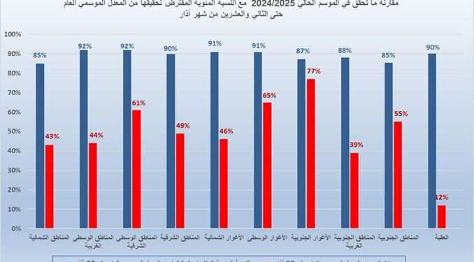 الرسم البياني ادناه يبين ما تحقق من الموسم المطري العام في مناطق المملكة خلال الموسم الحالي 2024/2025 حتى صباح يوم 22/03/2025.