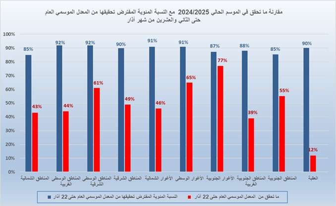 الرسم البياني ادناه يبين ما تحقق من الموسم المطري العام في مناطق المملكة خلال الموسم الحالي 2024/2025 حتى صباح يوم 22/03/2025.