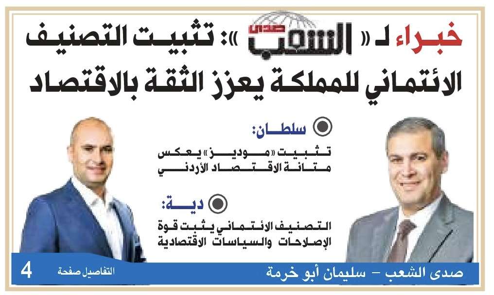 من جانبه أكد الخبير الاقتصادي منير دية أن تثبيت وكالة «موديز» للتصنيف الائتماني السيادي طويل الأجل للأردن عند درجة Ba3 مع نظرة مستقبلية مستقرة، يأتي في وقت يشهد فيه الإقليم تحديات جيوسياسية معقدة وحرباً دائرة في الشرق الأوسط، انعكست آثارها على اقتصادات المنطقة والعالم، مشيراً إلى أن هذا القرار يدعم الإصلاحات الاقتصادية التي انتهجتها الحكومة خلال الفترة الماضية، والتي انعكست على عدد من المؤشرات الاقتصادية الرئيسية.