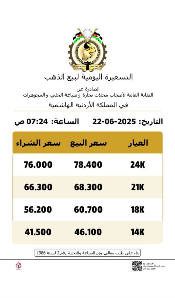 وبحسب التسعيرة اليومية الصادرة عن النقابة، فقد بلغ سعر بيع الغرام من عيار 21 “الأكثر تداولاً بين المواطنين” 68.300 دينارًا وسعر الشراء 66.300.