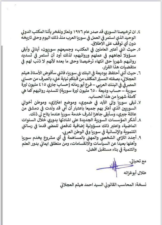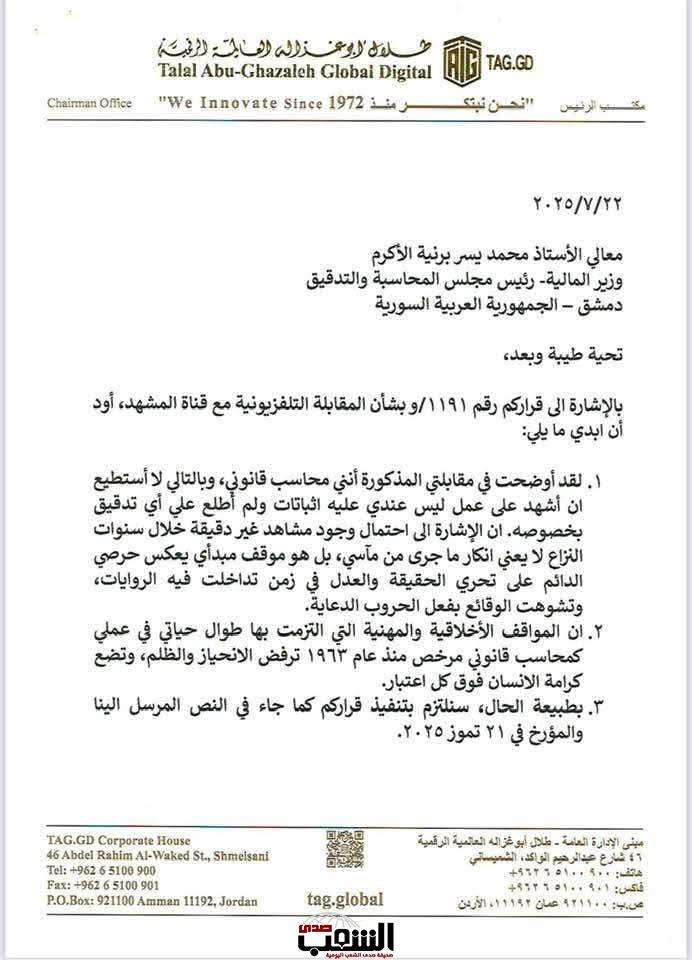 صدى الشعب - وجه رجل الأعمال الأردني، طلال أبو غزالة رسالة رد فيها على قرار وزير المالية السوري، بوقف نشاطات شركات أبو غزالة، بعد ما صدر منه من تصريحات تحابي النظام المخلوع، مؤيداً المجازر التي اقترفها نظام الهارب بشار، و تالياً رد أبو غزالة:
