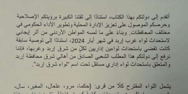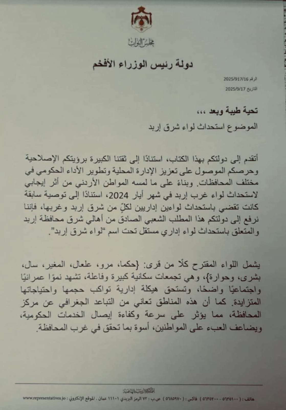 وأكد القبلان أن هذا المطلب يأتي استنادًا إلى توصية سابقة كانت تقضي باستحداث لواءين لكلٍّ من شرق إربد وغربها، مشددًا على أن الخطوة تمثل امتدادًا طبيعيًا لمسار الإصلاح الإداري الذي تنتهجه الحكومة، وترجمة عملية لرؤيتها في تطوير الأداء الحكومي وتوزيع الخدمات بعدالة بين جميع مناطق المملكة.