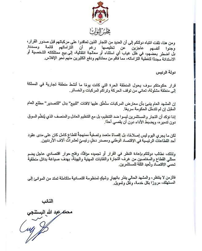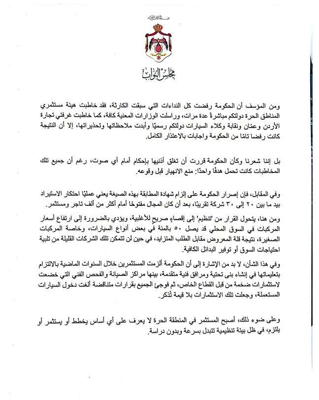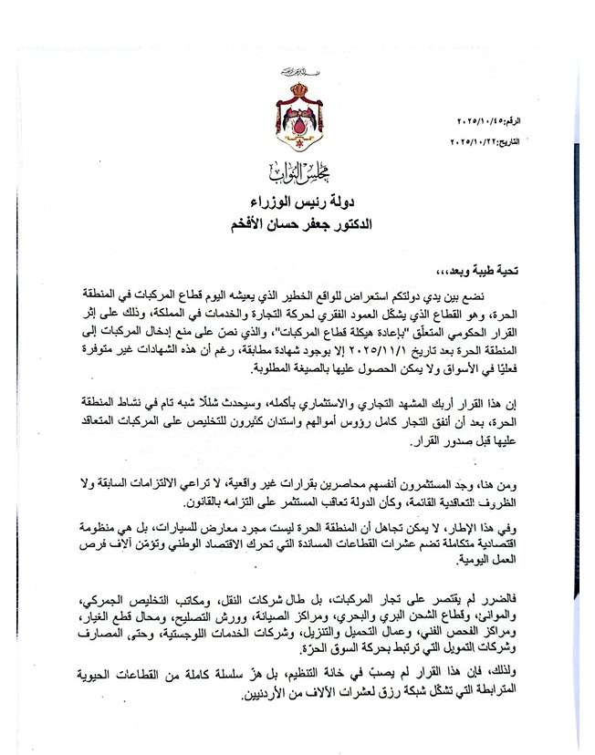 وقال النائب البستنجي، بحسب المذكرة، إن القرار فُرض دون دراسة واقعية كافية، فشهادات المطابقة المطلوبة غير متوفرة في ويستحيل إصدارها، مضيفًا أن القرار “سيغلق فعليًا أبواب المنطقة الحرة أمام حركة المركبات والنشاط التجاري.