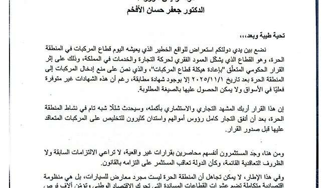 وشدد على أن القرار بصيغته الحالية “سيؤدي إلى توقف النشاط التجاري في المنطقة الحرة وتراجع الطلب إلى أدنى مستوياته، فيما تقترب معارض عديدة من الإغلاق الكامل”، محذرًا من أن “استمرار القرار سيقود إلى انهيار قطاع السيارات بكامل منظومته، ويحوّل المنطقة الحرة إلى مدينة تجارية خالية من الحركة خلال أشهر قليلة”.