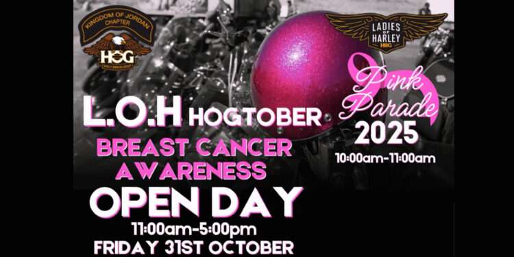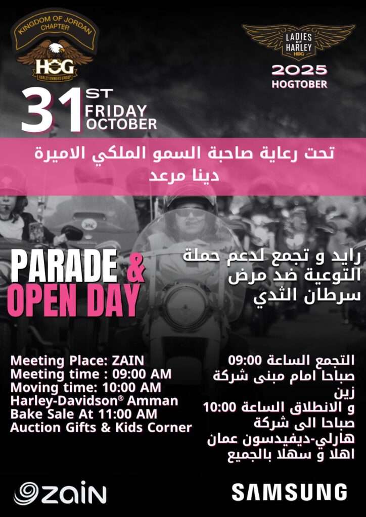 صدى الشعب – أعلنت مجموعة سيدات هارلي-ديفيدسون و مجموعة مالكي دراجات هارلي-ديفيدسون في الأردن و تحت رعاية صاحبة السمو الملكي الأميرة دينا مرعد، الناشطة العالمية في مجال التوعية والوقاية من مرض السرطان ، عن موعد إقامة فعالية هوغتوبَر – أكتوبر الوردي 2025، وذلك يوم الجمعة الموافق 31 تشرين الأول 2025 في موقع شركة هارلي-ديفيدسون – عمّان (قرية الدراجين).
