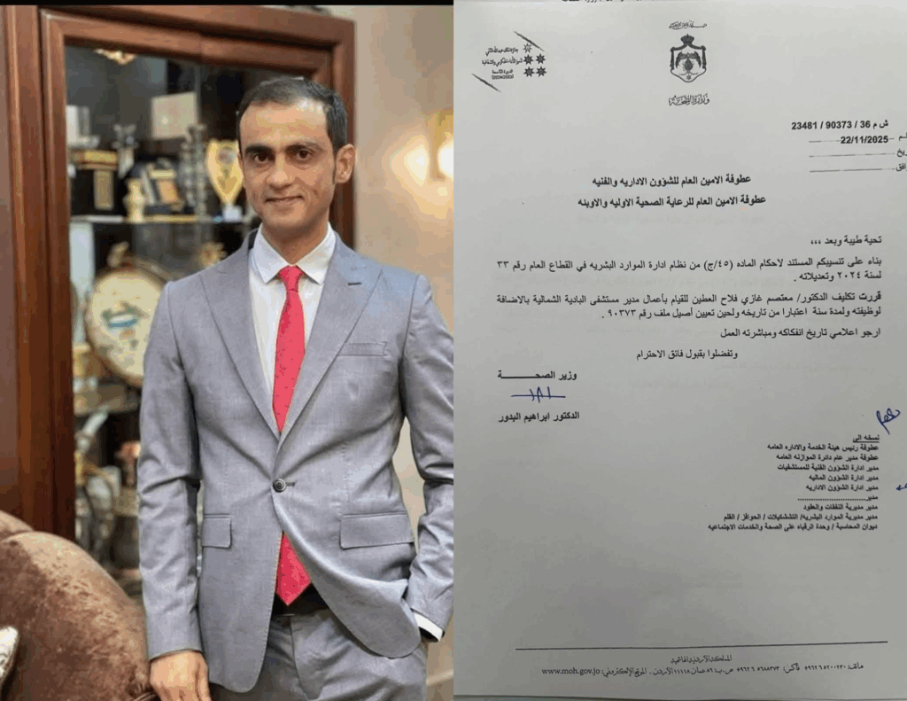 صدى الشعب – نبارك للأخ العزيز الدكتور معتصم غازي فلاح العطين تولّيك المنصب الجديد مديرًا لمستشفى البادية.