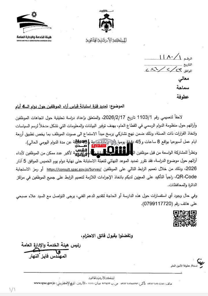 صدى الشعب – أعلنت هيئة الخدمة والإدارة العامة، الاثنين، تمديد فترة استقبال الآراء في الاستبانة الإلكترونية الخاصة بمقترح تطبيق نظام الدوام لأربعة أيام في الأسبوع حتى تاريخ 5 آذار 2026.