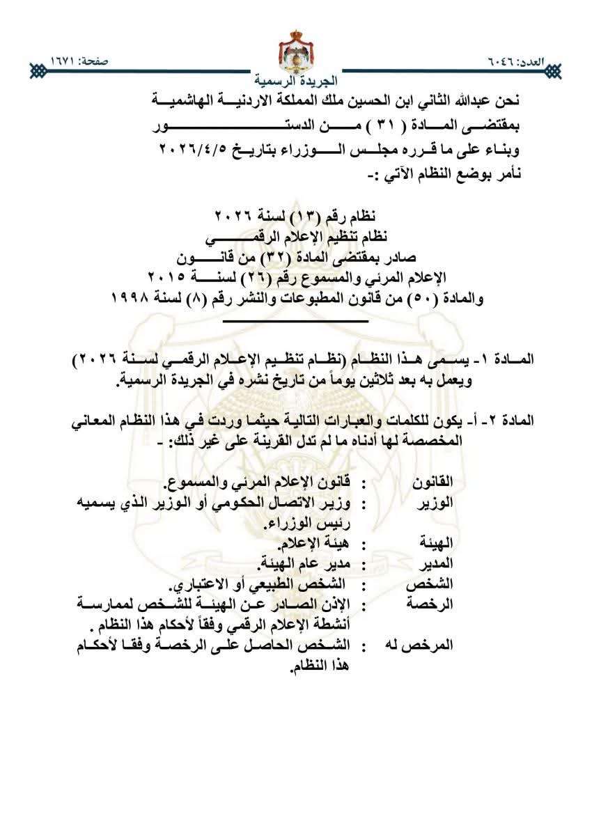 صدى الشعب – صدر في عدد الجريدة الرسمية اليوم الخميس، نظام تنظيم الإعلام الرقمي لسنة 2026.