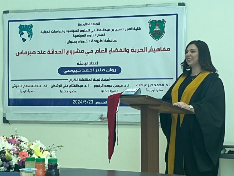 وناقشت الزميلة الجيوسي أطروحة الدكتوراة بعنوان “مفاهيم الحرية والفضاء العام في مشروع الحداثة عند هبرماس”، أمام لجنة تشكّلت من الأستاذ الدكتور محمد خير عيادات مشرفا ورئيسا، والأستاذ الدكتور فيصل الرفوع عضوا داخليا، والأستاذ الدكتور عبدالفتاح الرشدان عضوا داخليا، والأستاذ الدكتور عبدالله سالم النقرش عضوا خارجيا.