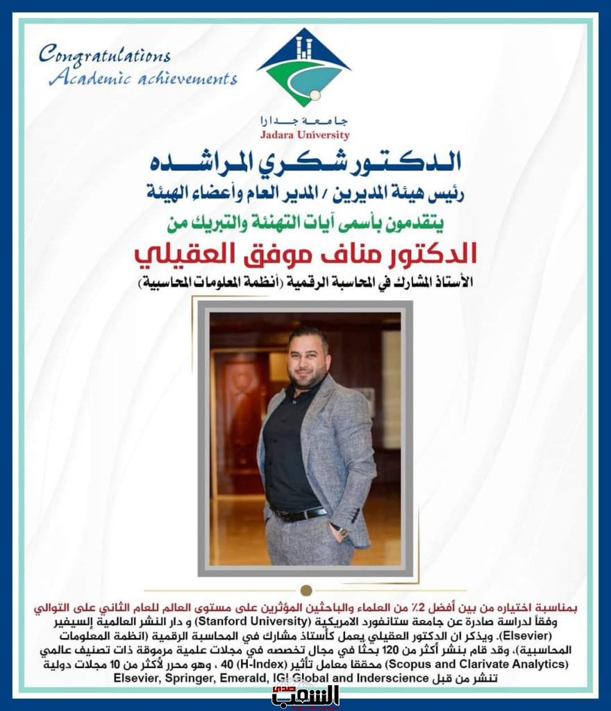 صدى الشعب- تتقدم جامعة جدارا، ممثلة برئيس هيئة المديري الدكتور شكري المراشدة، ورئيس الجامعة الأستاذ الدكتور حابس الزبون، وأسرة الجامعة، بأسمى آيات التهنئة والتبريك لأربعة من أساتذتها المتميزين لاختيارهم ضمن قائمة الـ 2% من العلماء الأكثر تأثيراً في العالم لعام 2024، وذلك وفق تصنيف جامعة ستانفورد الأمريكية، بالتعاون مع دار النشر العالمية “إلسيفير”، الذي يعتمد على المسيرة البحثية والعلمية.