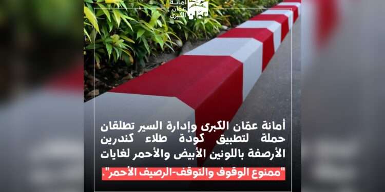 تبدأ أمانة عمّان الكبرى وبالتعاون مع إدارة السير، تنفيذ حملة ميدانية شاملة تهدف إلى طلاء كندرين الأرصفة باللونين الأبيض والأحمر، ورسم خطوط حمراء على جوانب الشوارع في مواقع حيوية، إلى جانب تعزيز الشواخص المرورية لمنع الوقوف والتوقف في تلك المواقع، وذلك ضمن جهودها لتنظيم وانسيابية حركة المرور وضبط مخالفات الوقوف والتوقف.