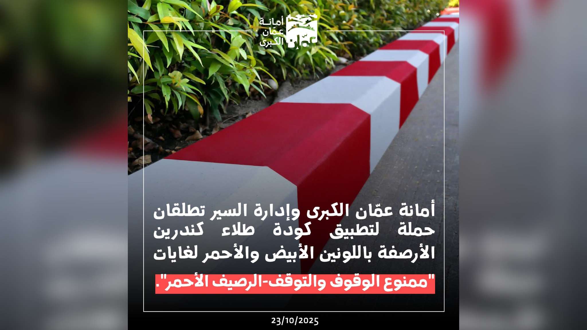 تبدأ أمانة عمّان الكبرى وبالتعاون مع إدارة السير، تنفيذ حملة ميدانية شاملة تهدف إلى طلاء كندرين الأرصفة باللونين الأبيض والأحمر، ورسم خطوط حمراء على جوانب الشوارع في مواقع حيوية، إلى جانب تعزيز الشواخص المرورية لمنع الوقوف والتوقف في تلك المواقع، وذلك ضمن جهودها لتنظيم وانسيابية حركة المرور وضبط مخالفات الوقوف والتوقف.