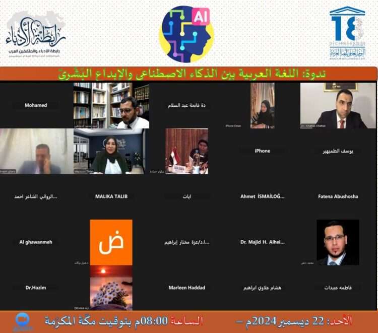 صدى الشعب – نظّمت رابطة الأدباء والمثقفين العرب، برعاية رئيسة الرابطة الدكتورة ميسون عيسى تليلان السليم، ندوة علمية تحت عنوان “اللغة العربية بين الذكاء الاصطناعي والإبداع البشري”، وذلك عبر منصّة “زووم” يوم الأحد الموافق 22 ديسمبر 2024، الساعة الثامنة مساءً بتوقيت مكة المكرمة، بمناسبة اليوم العالمي للغة العربية.