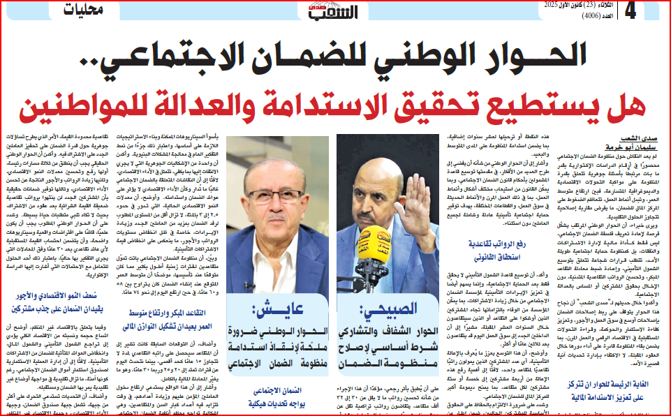 ويرى خبراء أن الحوار الوطني المرتقب يشكّل فرصة لإعادة تعريف فلسفة الضمان الاجتماعي، ليس فقط كأداة مالية لإدارة الاشتراكات والنفقات، بل كمنظومة حماية اجتماعية طويلة الأمد، تتطلب قرارات شجاعة تتعلق بتوسيع الشمول التأميني، وإعادة ضبط معادلة التقاعد المبكر، وتحسين الرواتب التقاعدية المتدنية، دون الإخلال بحقوق المشتركين أو المساس بالعدالة الاجتماعية.