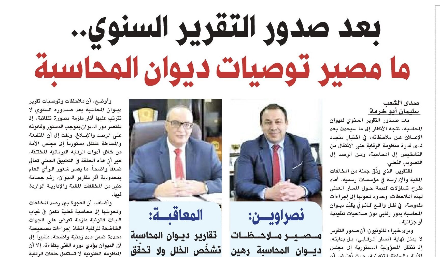 وأكد أن تقرير ديوان المحاسبة، في ظل الإطار الدستوري والقانوني القائم، يظل وثيقة رقابية ذات قيمة عالية في الكشف والتشخيص، لكنه لا يتحول إلى أداة مساءلة وإصلاح فعلي إلا إذا استكملت حلقاته بإلزام تشريعي واضح، يحدد آجالاً زمنية للتنفيذ ويرتب آثاراً قانونية على التقاعس، بما ينسجم مع الغاية التي توخاها المشرع الدستوري في المادة (119)، ويعزز حماية المال العام وثقة المجتمع بمؤسسات الرقابة.