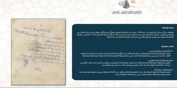 صدى الشعب – في مناسبة الذكرى 79 لاستقلال المملكة الأردنية الهاشمية، عرض مركز التوثيق الملكي الأردني الهاشمي وثيقة تاريخية نادرة تعود إلى عام 1928، تكشف لأول مرة عن تفاصيل أول احتفال رسمي بالاستقلال في إمارة شرق الأردن، الذي نظمته متصرفية عجلون آنذاك.