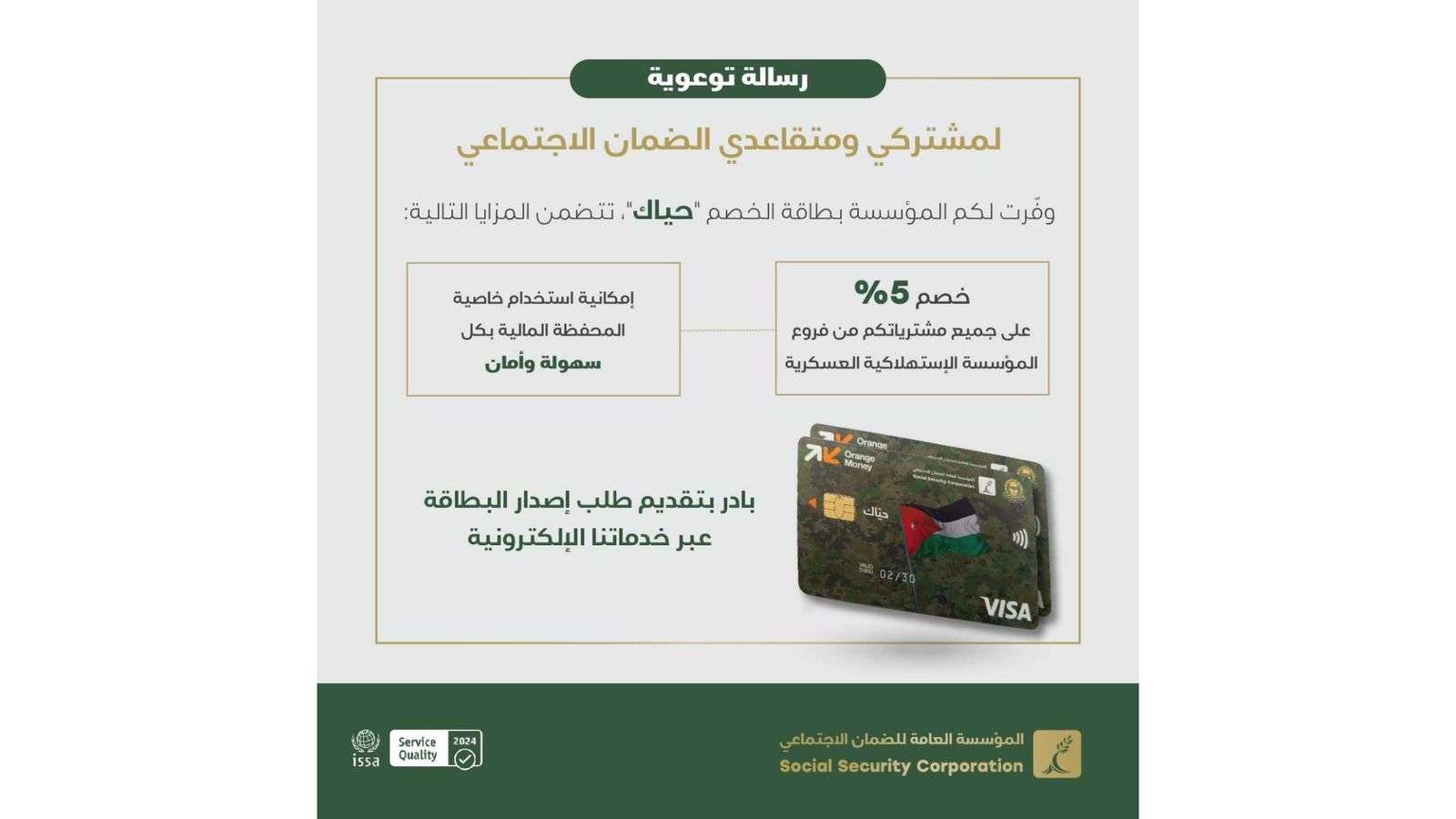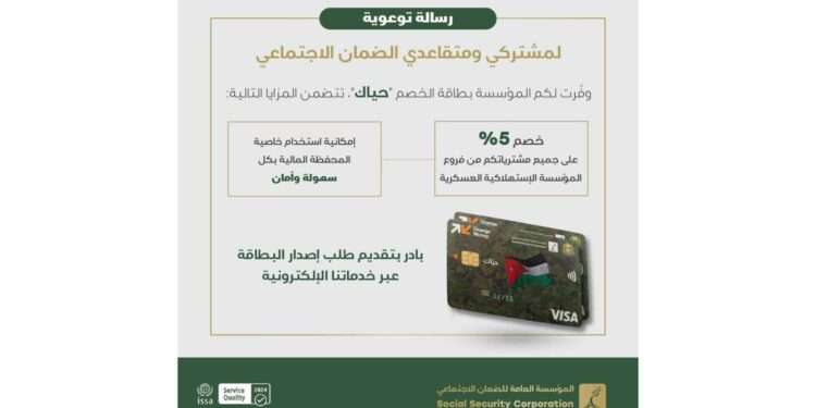دعت المؤسسة العامة للضمان الاجتماعي كافة المؤمن عليهم والمتقاعدين إلى إصدار بطاقة الخصم “حيّاك”، وذلك للاستفادة من المزايا التي توفرها بطاقة الخصم والتي تتمثل في نسبة خصم (5%) على المشتريات من كافة فروع أسواق المؤسسة الإستهلاكية العسكرية، إضافة إلى إمكانية شحن البطاقة واستخدام خاصية المحفظة المالية حسب تعليمات البنك المركزي الصادرة بهذا الخصوص.