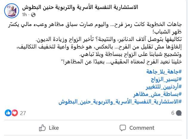 صدى الشعب – نشرت الاستشارية النفسية الأسرية والتربوية حنين البطوش عبر صفحاتها على مواقع التواصل الاجتماعي منشورًا بعنوان: أطالب بإلغاء جاهات الخطوبة… لنُسقط الجاهات قبل أن تُسقط شبابنا في الديون.