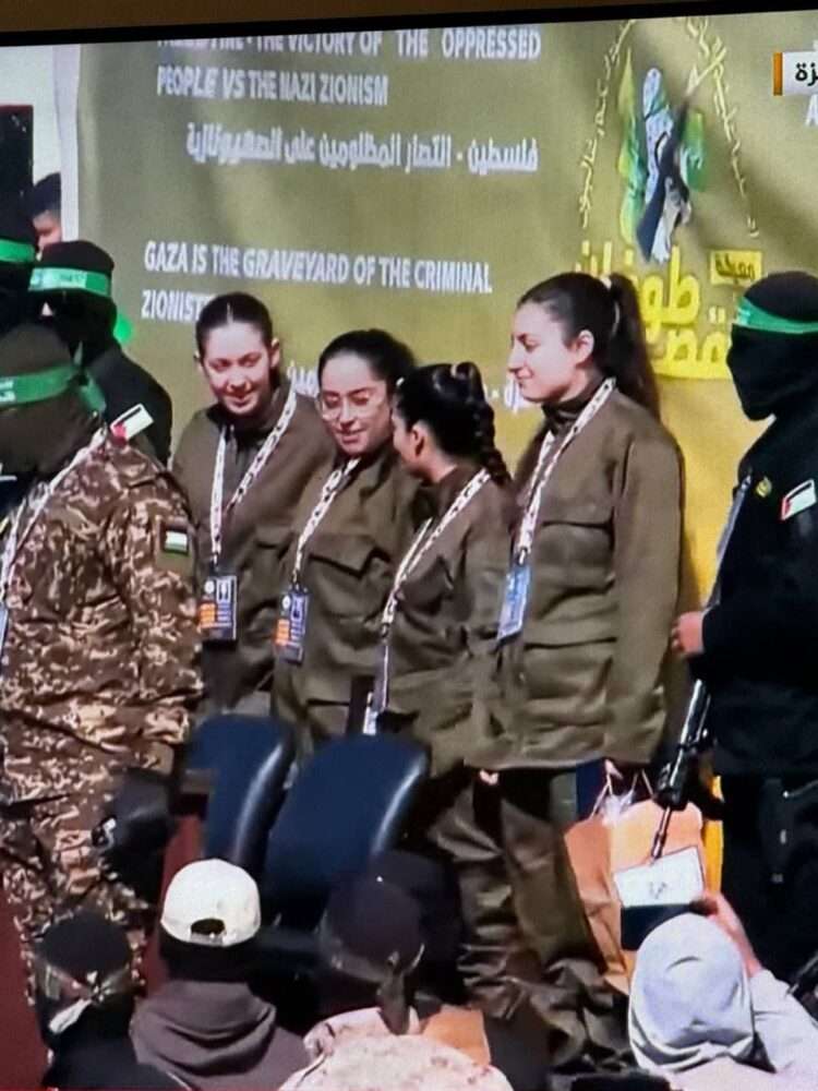 وظهرت المجندات جانب إلى عناصر من المقاومة على منصة أقيمت في الميدان، وشهدت توقيع اتفاق للتسليم بين ممثل للقسام وآخر من الصليب الأحمر.