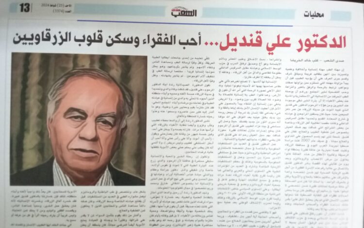 الإنسانية لها أناسها لا تصلح لغيرهم تأتي على مقاس صاحبها يوهبها الله لأحبته ليكونوا تجليا ولله المثل الأعلى لصورة الرحمة التي أمر الله أن تكون في الأرض، وكما قالوا: الطب بلا إنسانية كالصلاة بلا وضوء فلا الصلاة تقرب دون وضوء.. ولا المريض يشفى دون إنسانية إن الشفاء يبدأ بالحصول على الأمل فإن أعطيت الإنسان الأمل بادلك إياها بالثقة ولا شيء يضاهي ثقة إنسان بك لدرجة أن يجعل روحه بين يديك يغلق عينيه بعد التوكل على الله موقنا أنه سيرى النور من جديد بفضلك حيث وصل إلى مسامعي في بيت عزاء الطبيب علي قنديل أن المرحوم كان يدفع إجارات منازل لعائلات فقيرة معوزة ضاقت بهم سبل العيش رحم الله علي قنديل الذي كان يضيء للفقراء حاجاتهم الطبية والانسانية .