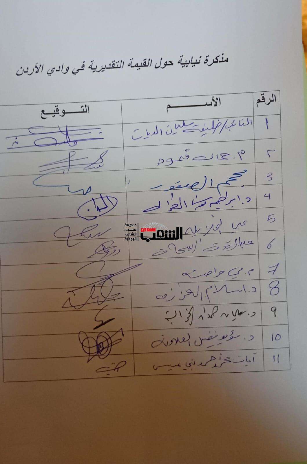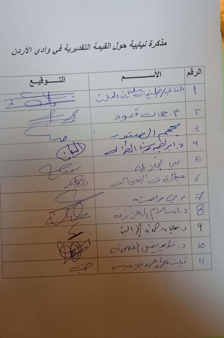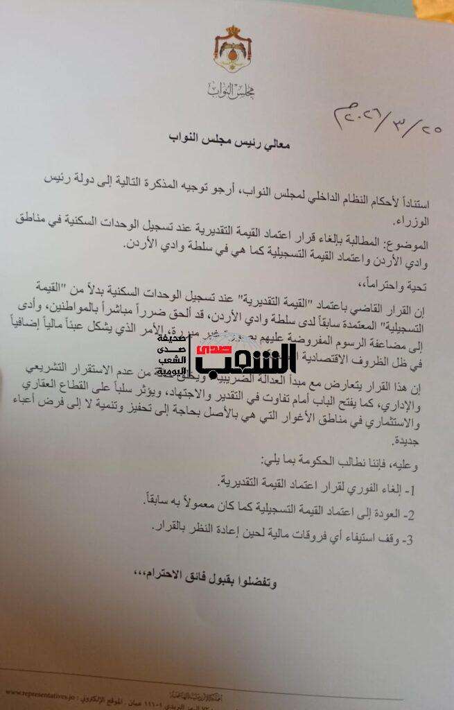 تبنى رئيس اللجنة الإدارية النيابية، مذكرة وقع عليها 11 نائباً، يطالب الحكومة بتعديل القيمة التقديرية عند تسجيل الوحدات السكنية في مناطق وادي الأردن واعتماد القيمة التسجيلية كما هي في سلطة وادي الأردن.