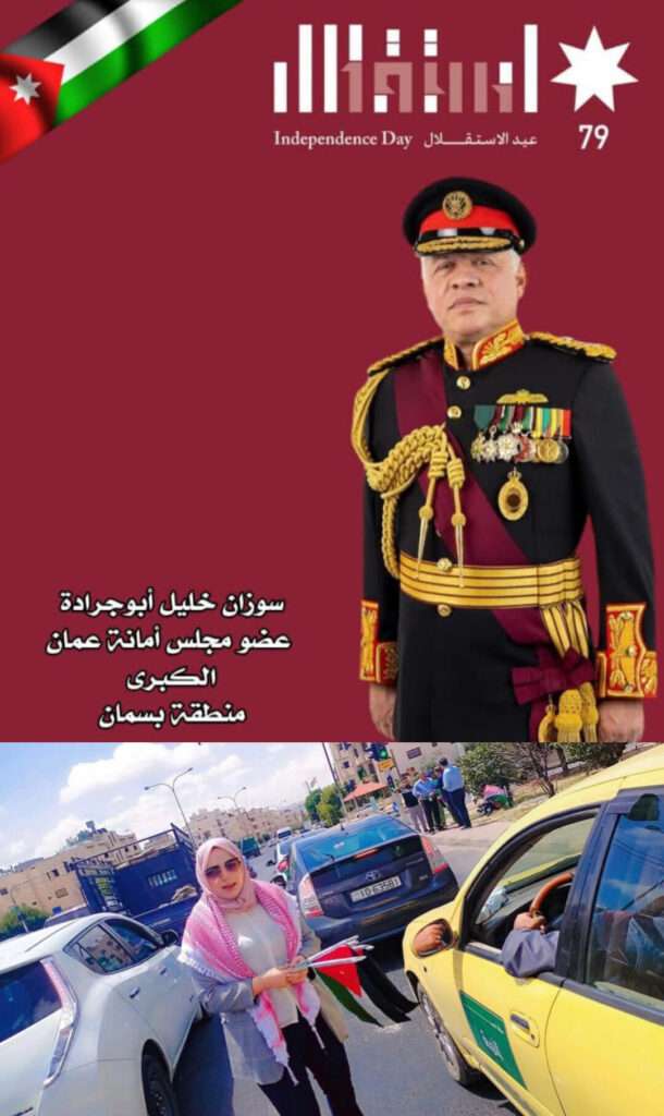 لمنطقة بسمان، سوزان خليل أبو جرادة حضرة صاحب الجلالة الملك عبدالله الثاني ابن الحسين المعظم حفظه الله ورعاه و ولي عهده الأمين و كل الأردنيين باحتفالات المملكة بعيد الاستقلال الـ79 و تالياً ما كتبته عبر صفحتها الرسمية: