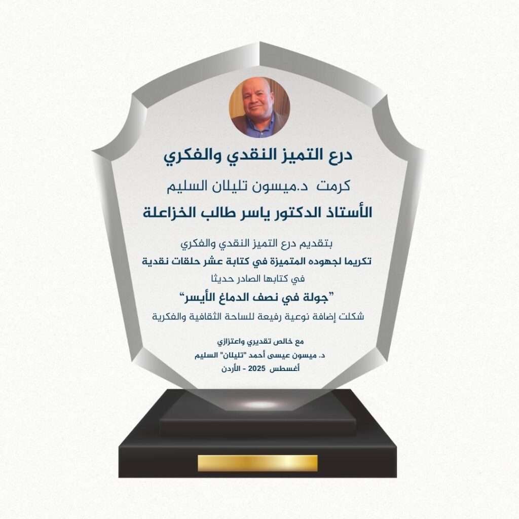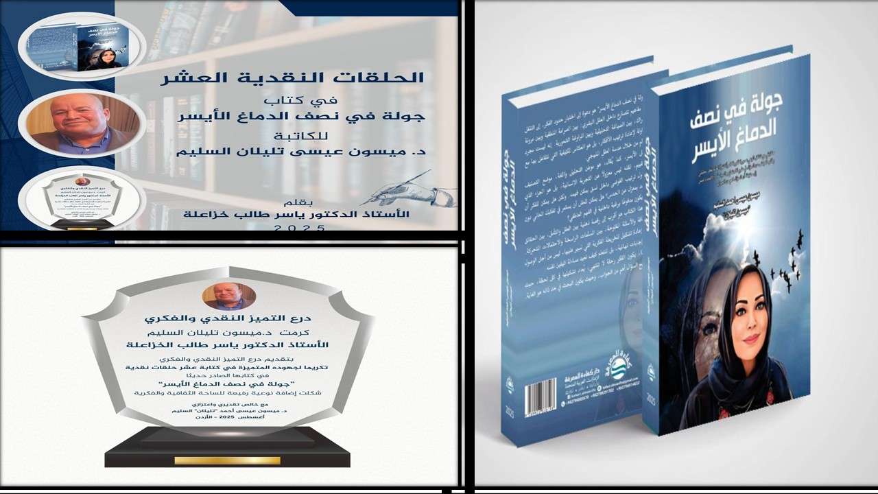وفي ختام هذه التجربة النقدية الثرية، قدّمت الدكتورة ميسون السليم درع التميّز الفكري إلى الأستاذ الدكتور الخزاعلة، تقديرًا لجهوده الريادية في هذه المبادرة المتميّزة، مؤكّدة أنّ هذه القراءات ستُوثَّق قريبًا في كتيّب مستقل يحمل عنوان: “القراءات النقدية العشر في كتاب جولة في نصف الدماغ الأيسر”.