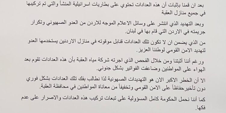 وأردف الكتاب الموجه لدولة رئيس الوزراء وحصلت صدى الشعب على نسخة منه بالتحذير من تلك العدادات والتي قد تكون قنابل موقوته في منازل المواطنين مطالبين بفك تلك العدادات وخصوصا مع تنامي التهديدات الصهيونية للأردن