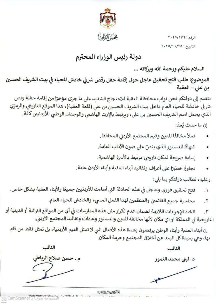 وجّه نائبا محافظة العقبة، الدكتورة لبنى محمد النمور والمهندس حسن صلاح الرياطي، كتابًا رسميًا إلى دولة رئيس الوزراء، طالبا فيه بفتح تحقيق عاجل حول إقامة حفل رقص شرقي خادش للحياء داخل بيت الشريف الحسين بن علي (قلعة العقبة)، معتبرين ما حدث إساءة واضحة للمكان وقيم المجتمع الأردني.